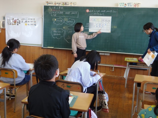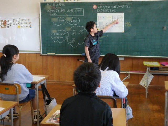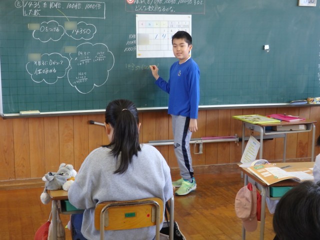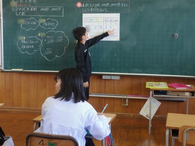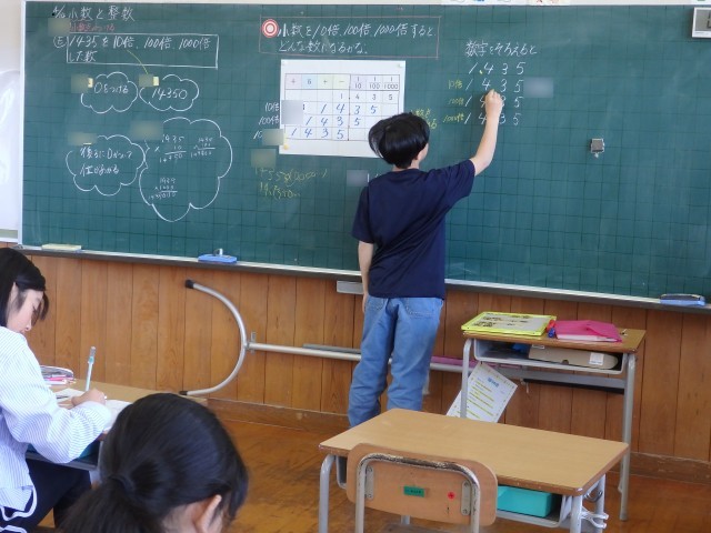 5年生の1時間目は算数の授業でした。「小数と整数」の学習です。まずは「1435を10倍、100倍、1000倍するとどうなるか」を復習しました。その後、1.435という小数を10倍、100倍、1000倍すると小数点の位置はどうなるのかを考えました。発言がどんどん繋がっていきました。