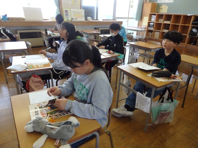5年生の4時間目は図書室で読書です。自分で読みたい本を選んで借りました。授業が終わるというところでしたので、写真のようなリラックスムードでした。たくさん本を読んで活字に親しんでほしいです。
