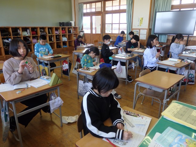 5年生の4時間目は図工の授業でした。「切り分けた形から何つくる?」の学習で作っていたパズルが完成しました。自分の作品について「よくできたところ」「工夫したところ」など振り返りを書いたら、他の子が作ったパズルに挑戦です。ジグソーパズルのように難しいパズルを作った子がいて、何人かで協力して挑戦していました。他の子の作品のよいと思ったところも振り返りで書きました。