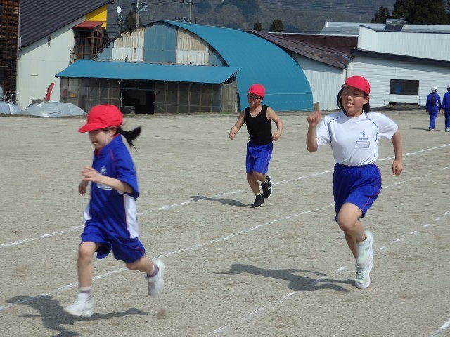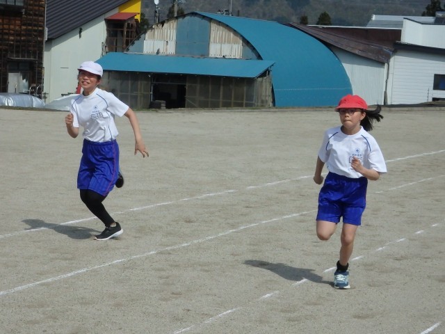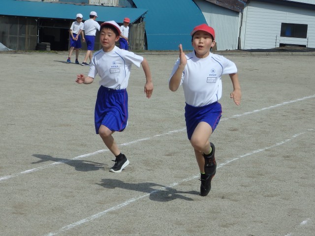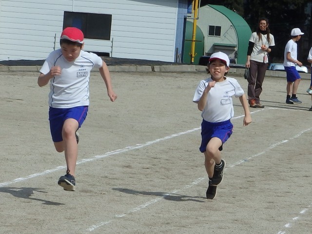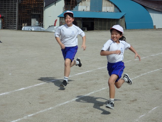 5,6年生合同の体育の授業。5年生の100mを走る姿です。5年生は去年の運動会は70m走でしたので、これが初めての100m走ですね。30m長くなった漢字はどうだったでしょうか。