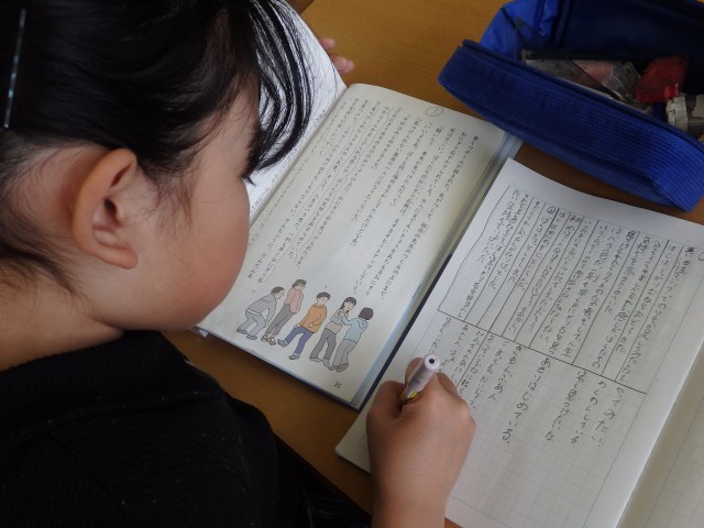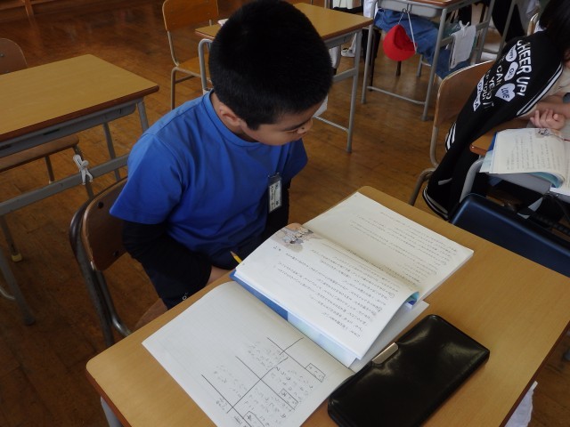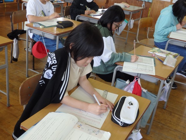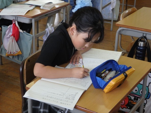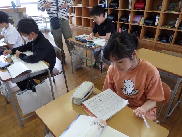5年生の1時間目は社会の授業でした。「世界の中の日本の国土」の学習です。日本列島を北海道から沖縄までをノートに描いていました。ノート1ページに収まるようにするのが難しいらしく、何度も描き直しをしていました。それでも根を上げずに、どの子も一生懸命に取り組んでいました。