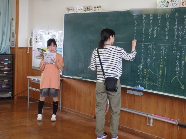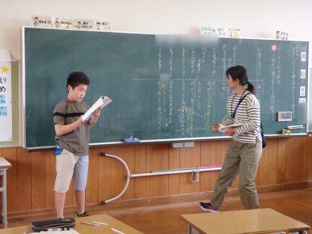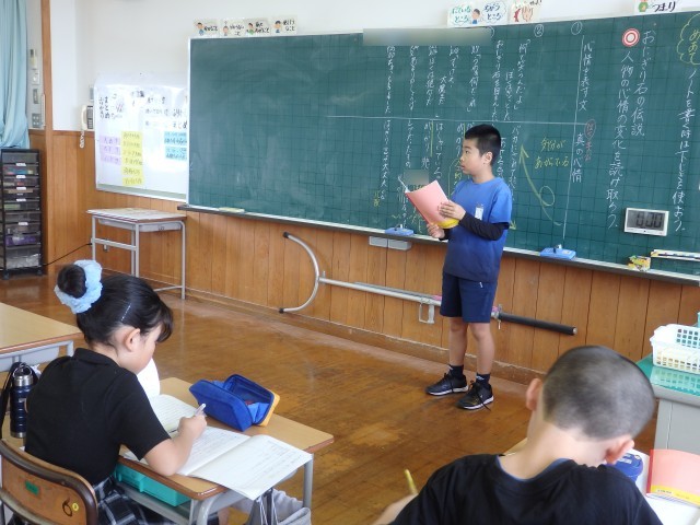 5年生の2時間目は国語の授業でした。今日から「おにぎり石の伝説」の学習です。先生がこの単元の目標である「心情を表すように音読をする」について話しをすると、「もうできるよ!」という声が。確かに音読上手な5年生です。まずは、みんなで丸読みをしました。読み方が分からない漢字に書き込みをしたり、鉛筆で「今読んでいるところ」を追いながら読んだりと工夫している子がいました。