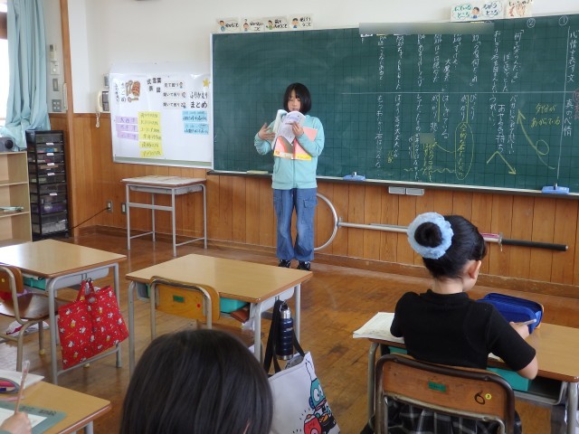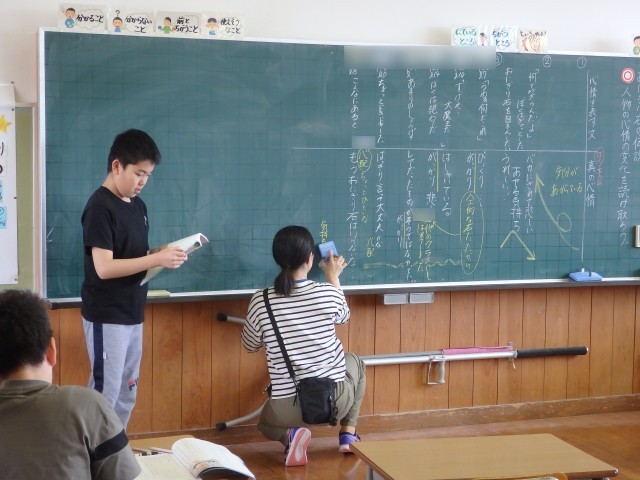 5年生の1時間目は国語の授業でした。「おにぎり石の伝説」の授業です。主人公の心情を読み取っていました。教科書の主人公の様子が書かれている文に線を引き、その文から読み取った主人公の心情や気持ちの上がり下がりを発表していました。