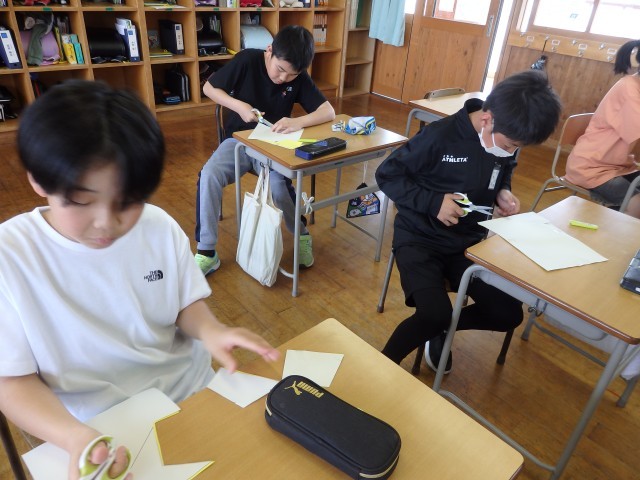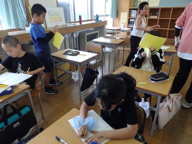 5年生の4時間目は図工の授業でした。「切り分けた形から何つくる?」の学習で作っていたパズルが完成しました。自分の作品について「よくできたところ」「工夫したところ」など振り返りを書いたら、他の子が作ったパズルに挑戦です。ジグソーパズルのように難しいパズルを作った子がいて、何人かで協力して挑戦していました。他の子の作品のよいと思ったところも振り返りで書きました。