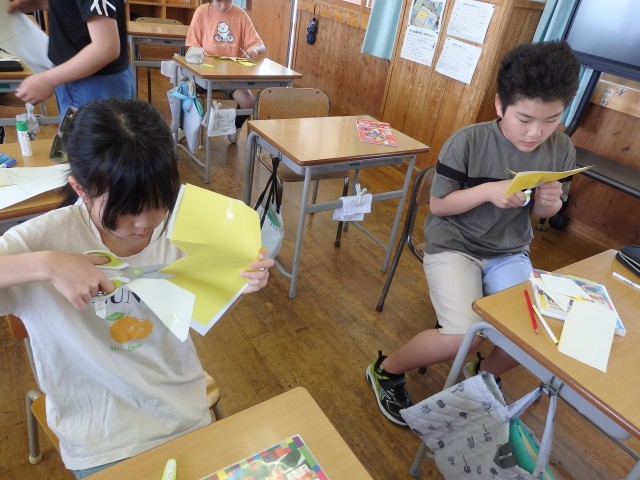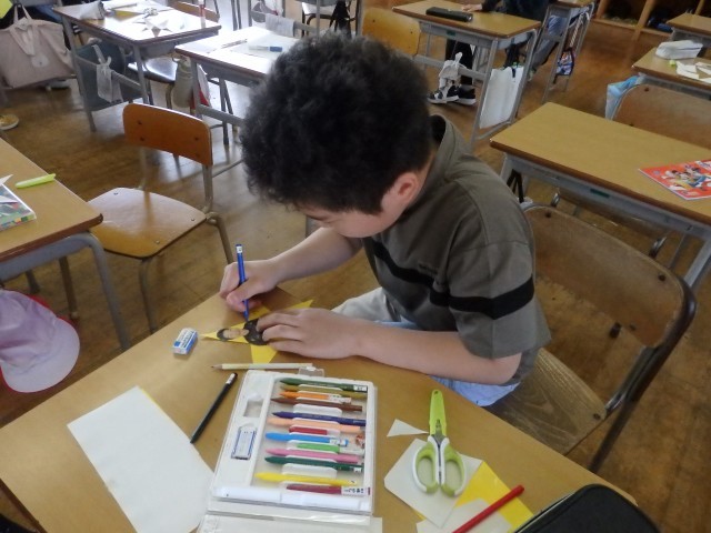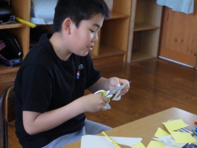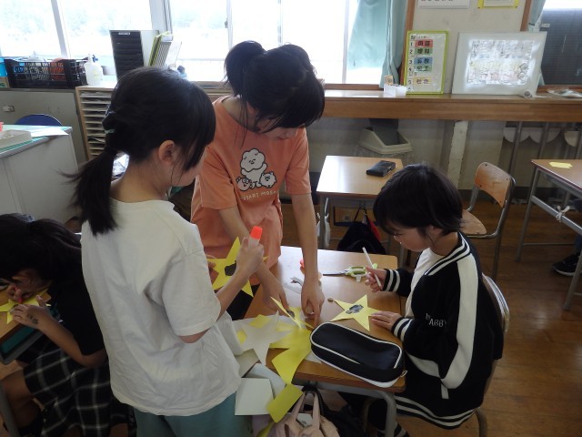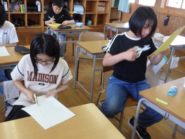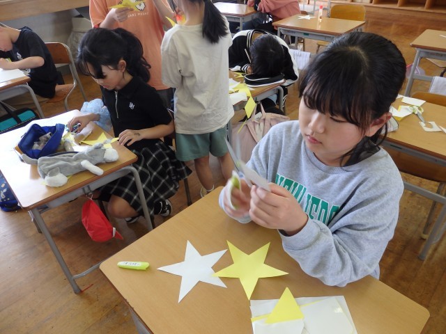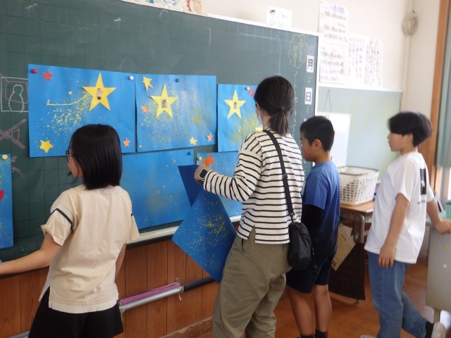 5年生の4時間目は図工の授業でした。学級目標の掲示物を作っていました。1人が1枚ずつ色画用紙で星を作ります。そこに自分の写真を貼り、クーピーなどで好きな模様を描きます。1人1人が輝く星になって、前の授業で作った夜空に貼っていきます。きれいな掲示物ができましたね。