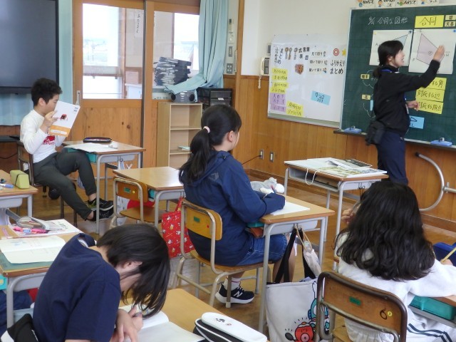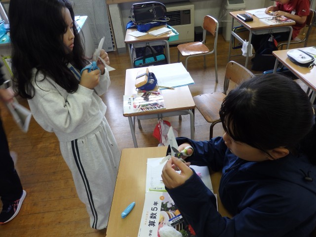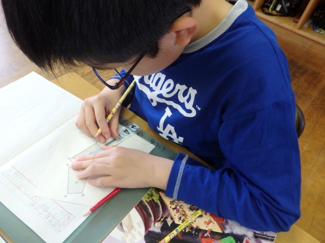 5年生の1時間目は算数の授業でした。「合同な図形」の学習です。合同になる図形にはどんなルールがあるのか考えました。配られた2つの合同な四角形の辺の長さを定規で測ったり、角の大きさを分度器で測ったり、切って重ねたりして調べました。「合同」のルールは見つかったでしょうか。
