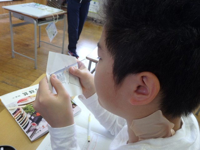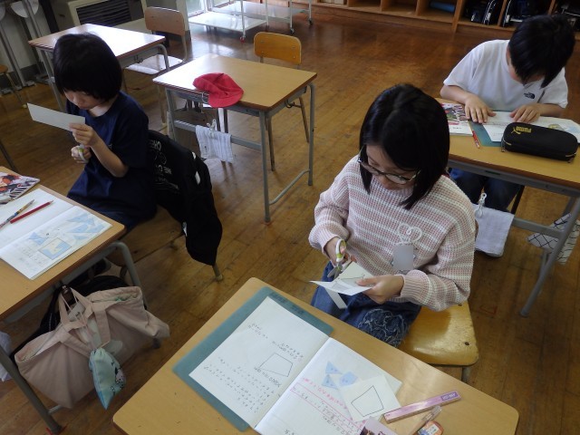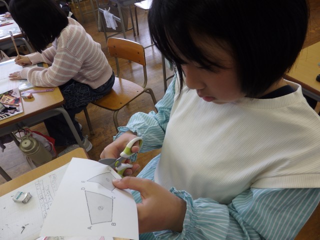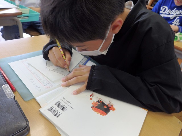 5年生の4時間目は図工の授業でした。「切り分けた形から何つくる?」の学習で作っていたパズルが完成しました。自分の作品について「よくできたところ」「工夫したところ」など振り返りを書いたら、他の子が作ったパズルに挑戦です。ジグソーパズルのように難しいパズルを作った子がいて、何人かで協力して挑戦していました。他の子の作品のよいと思ったところも振り返りで書きました。