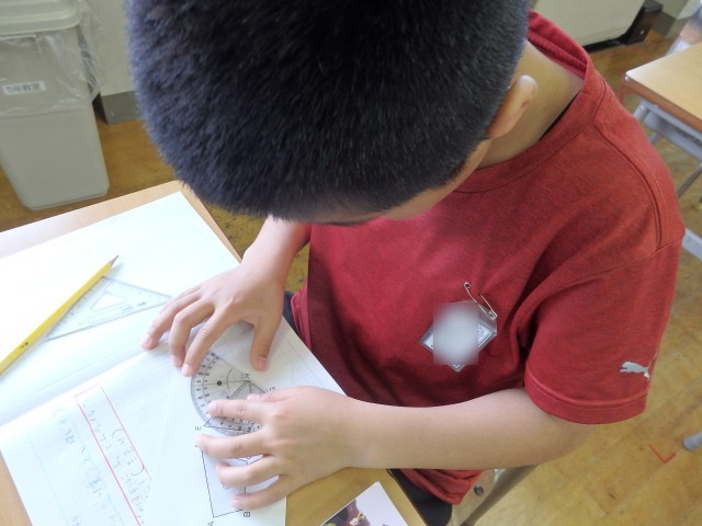 5年生の2時間目は算数の授業でした。「正多角形」の学習です。教科書に載っているQRコードを読み込んで立ち上げたアプリを使って、プログラミング学習も兼ねて行いました。「○センチ前に進む」、「○°右/左に曲がる」というコマンドを入力して、いろいろな正多角形を描いていきました。「正多角形の1つの角の大きさ」という基本を理解している必要があります。また、内容や順番も正しくコマンドを入力しないと図形が完成しません。とても集中して取り組んでいました。