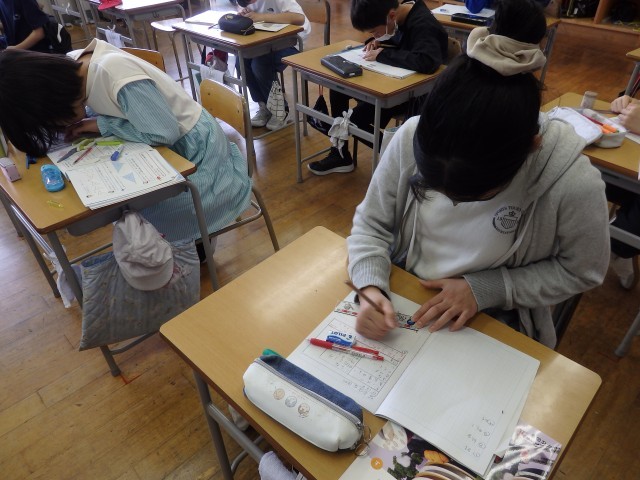 5年生の3時間目は算数の授業でした。5年生のまとめとして、ワークを使って総復習をしていました。最初、誰もいないのかと思うほどシーンとしていました。みんなが集中して静かな教室に鉛筆の音だけが聞こえていました。