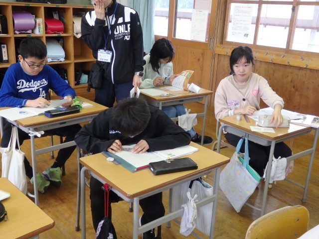 5年生の3時間目は「林業」についての出前授業でした。市農林課と森林組合の方を講師としてお招きし、お話を聞いたり、3つの体験をしたりして木や林業について学びました。お話を聞きながらビッシリとメモをとっている子がいました。また、体験では保冷剤で冷やした木材と金属に触って冷たさの違いを確かめたり、4種類の木材の匂いを嗅いでどれが何の木なのか考えたり、同じ大きさの木材、ゴム、金属を水の中に入れるとどうなるか実験したりしました。くろもじの木のいい匂いが気に入ったのか、講師の方に「これもらってもいい?」と聞いている子がいました。