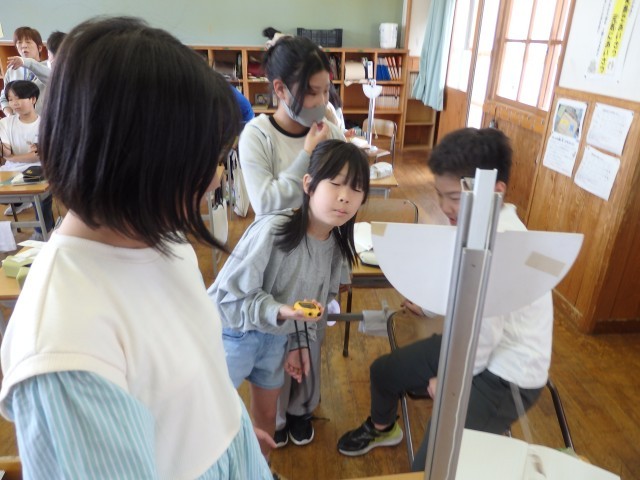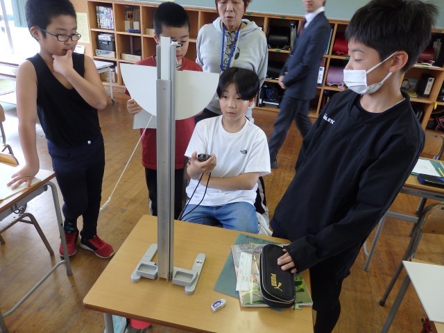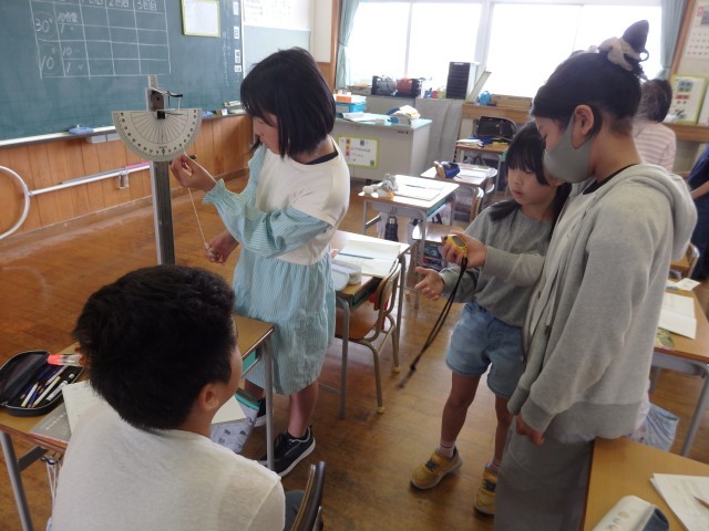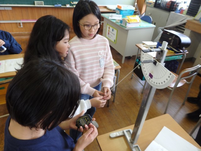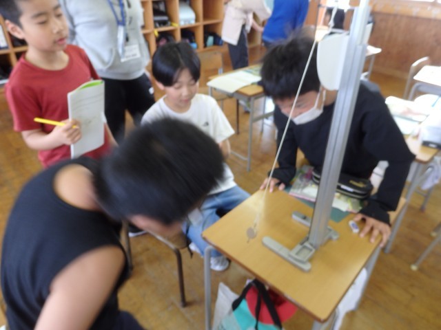 5年生の2時間目は理科の授業でした。振り子の実験をしていました。振り子のスタートを角度10°からと30°からでどんな違いがあるのかを調べました。班で協力しながら実験に取り組んでいました。