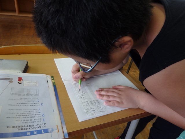 5年生の1時間目は社会の授業でした。「世界の中の日本の国土」の学習です。日本列島を北海道から沖縄までをノートに描いていました。ノート1ページに収まるようにするのが難しいらしく、何度も描き直しをしていました。それでも根を上げずに、どの子も一生懸命に取り組んでいました。