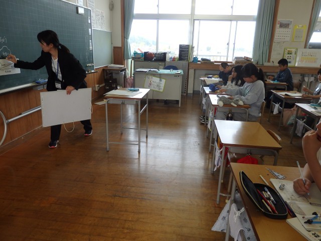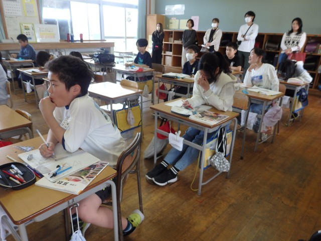 5年生の3時間目は「林業」についての出前授業でした。市農林課と森林組合の方を講師としてお招きし、お話を聞いたり、3つの体験をしたりして木や林業について学びました。お話を聞きながらビッシリとメモをとっている子がいました。また、体験では保冷剤で冷やした木材と金属に触って冷たさの違いを確かめたり、4種類の木材の匂いを嗅いでどれが何の木なのか考えたり、同じ大きさの木材、ゴム、金属を水の中に入れるとどうなるか実験したりしました。くろもじの木のいい匂いが気に入ったのか、講師の方に「これもらってもいい?」と聞いている子がいました。