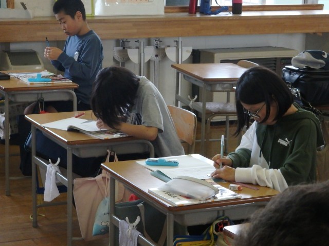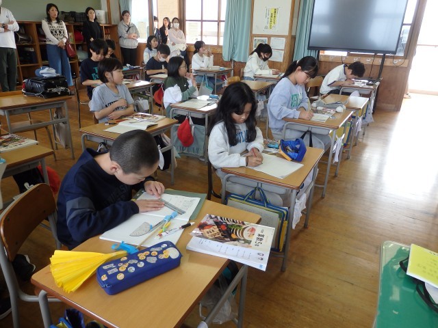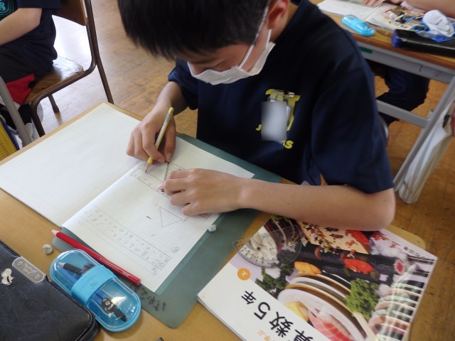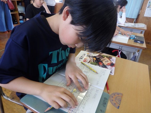 5年生の1時間目は社会の授業でした。「世界の中の日本の国土」の学習です。日本列島を北海道から沖縄までをノートに描いていました。ノート1ページに収まるようにするのが難しいらしく、何度も描き直しをしていました。それでも根を上げずに、どの子も一生懸命に取り組んでいました。