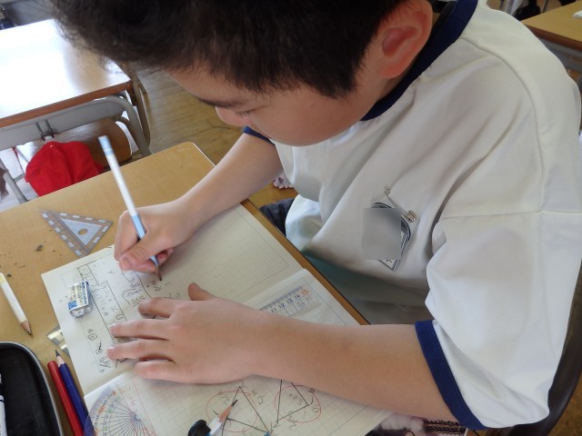 5年生の3時間目は算数の授業でした。「立体」の学習です。三角柱の展開図を見て、それぞれの辺の長さを求めたり、点Aに集まる点はどれかを考えました。三角柱がどんな立体なのかを正しく理解して、展開図を頭の中で組み立てて考える必要があります。途中、昨日の自学で「32角柱」を作図したこのノートが紹介されました。しかも、しっかり定規を使って正確に描いてありました。すごい!