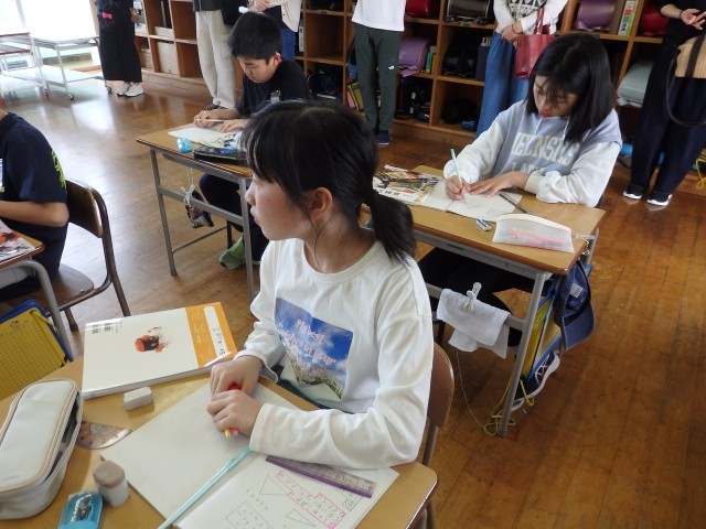 5年生は3,4時間目に、毎年、米づくりの先生をしていただいている地域の方の作業場へ出掛け、すじ撒きの見学をしました。先生のお話を聞いたり、機械ですじ撒きをしている様子を観察しながら、熱心にメモをとっていました。中には種籾が撒かれ運んでいく機械の様子を分かりやすく図に描いている子もいました。