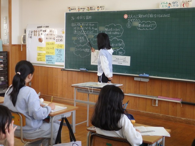 5年生の学習参観は算数の授業でした。「合同な図形」の学習です。「辺ABの長さが4cm、辺BCの長さが4.4cm、角Cの大きさが60°」という条件で書かれた2つの三角形が黒板に掲示されました。しかし、同じ条件のもとで描かれたはずなのに合同ではありません。2つの三角形が合同にならなかった理由を考えました。
