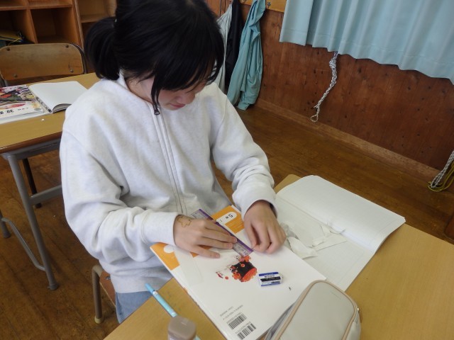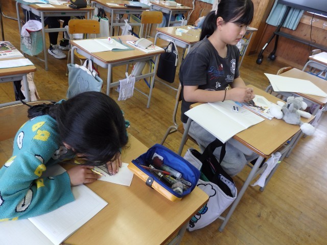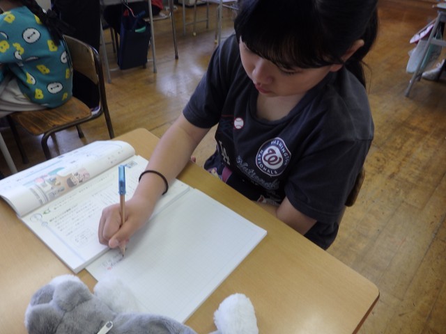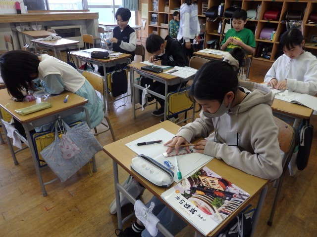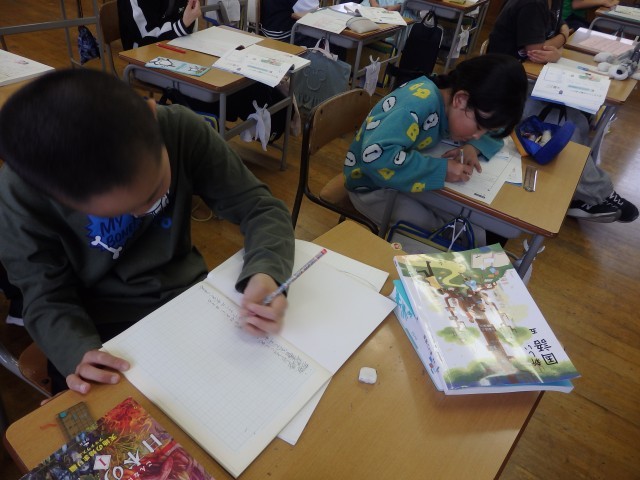 5年生の1時間目は社会の授業でした。「世界の中の日本の国土」の学習です。日本列島を北海道から沖縄までをノートに描いていました。ノート1ページに収まるようにするのが難しいらしく、何度も描き直しをしていました。それでも根を上げずに、どの子も一生懸命に取り組んでいました。