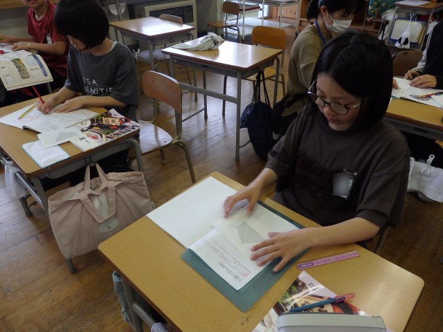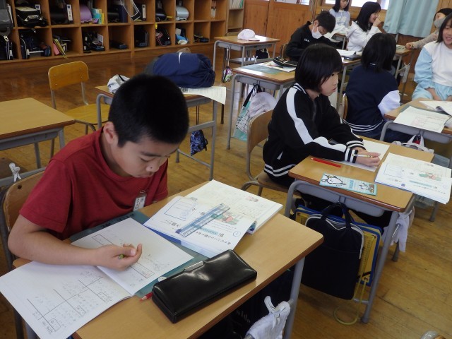 5年生の4時間目は図工の授業でした。「切り分けた形から何つくる?」の学習で作っていたパズルが完成しました。自分の作品について「よくできたところ」「工夫したところ」など振り返りを書いたら、他の子が作ったパズルに挑戦です。ジグソーパズルのように難しいパズルを作った子がいて、何人かで協力して挑戦していました。他の子の作品のよいと思ったところも振り返りで書きました。