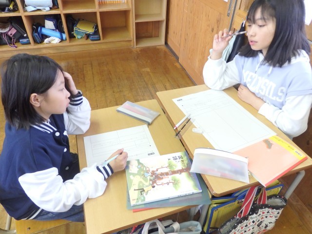 5年生の4時間目は国語の授業でした。「知りたいことを聞きだそう」の学習です。昨日に引き続き、6年生へのインタビューでどんな質問をするかを担当する委員会ごとに分かれて考えました。質問することが決まった班から、インタビューの練習をしていました。