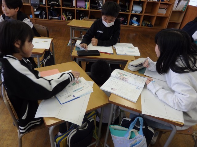 5年生の4時間目は学活の授業でした。係ごとに集まって係のポスターを作っていました。役割分担を話し合ったり、みんなでポスターを書いたりと協力して取り組んでいました。