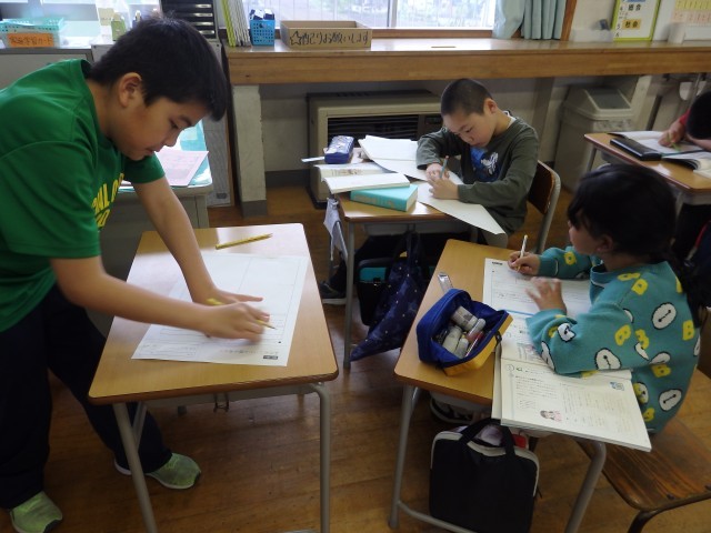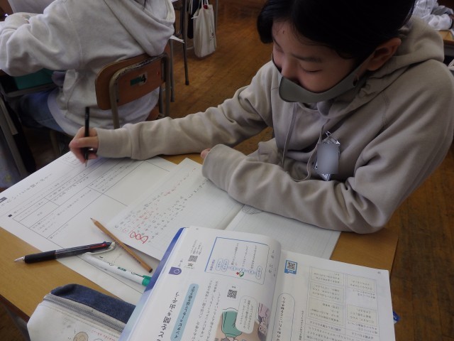 5年生の3時間目は算数の授業でした。5年生のまとめとして、ワークを使って総復習をしていました。最初、誰もいないのかと思うほどシーンとしていました。みんなが集中して静かな教室に鉛筆の音だけが聞こえていました。