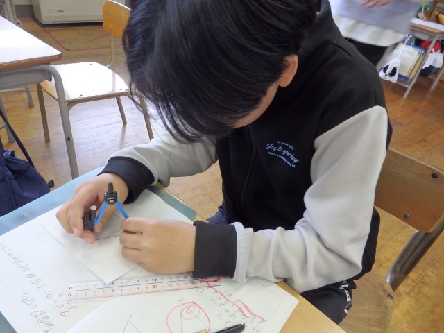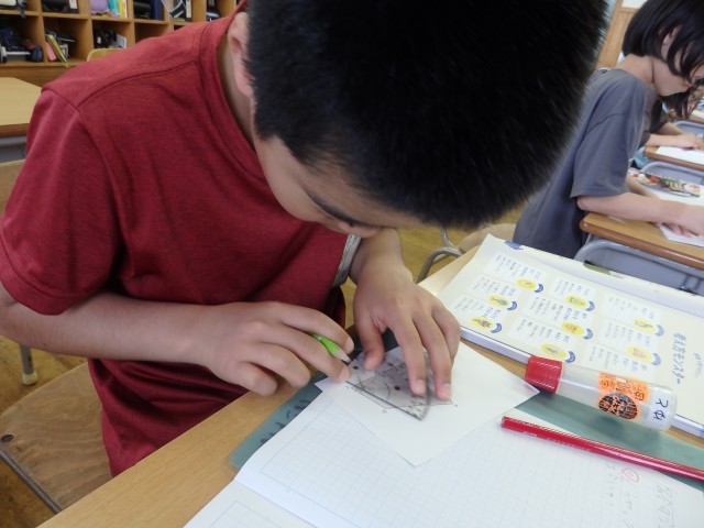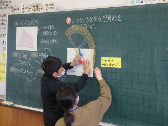 5年生の3時間目は算数の授業でした。「合同な図形」の学習です。まずは、ある四角形が提示されました。平行になる線が一つもない歪な四角形です。この四角形と合同な四角形をノートに作図しました。教え合いながら、定規で線の長さを、分度器で角の大きさを測って取り組んでいました。四角形に対角線を引き、2つの三角形として合同な図形を描いた子がやり方を発表しました。