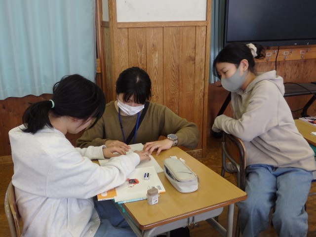 5年生の3時間目は「林業」についての出前授業でした。市農林課と森林組合の方を講師としてお招きし、お話を聞いたり、3つの体験をしたりして木や林業について学びました。お話を聞きながらビッシリとメモをとっている子がいました。また、体験では保冷剤で冷やした木材と金属に触って冷たさの違いを確かめたり、4種類の木材の匂いを嗅いでどれが何の木なのか考えたり、同じ大きさの木材、ゴム、金属を水の中に入れるとどうなるか実験したりしました。くろもじの木のいい匂いが気に入ったのか、講師の方に「これもらってもいい?」と聞いている子がいました。