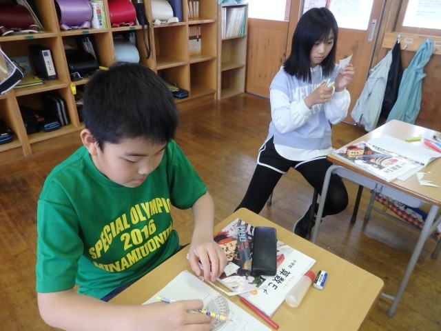 5年生の4時間目は図工の授業でした。学級目標の掲示物を作っていました。1人が1枚ずつ色画用紙で星を作ります。そこに自分の写真を貼り、クーピーなどで好きな模様を描きます。1人1人が輝く星になって、前の授業で作った夜空に貼っていきます。きれいな掲示物ができましたね。