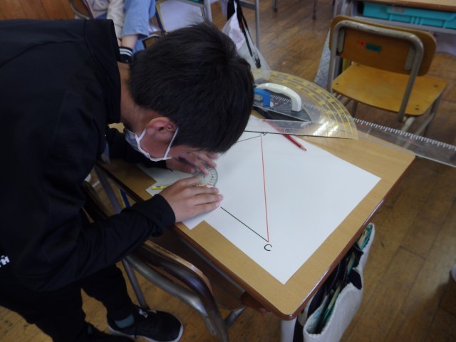 5年生の学習参観は算数の授業でした。「合同な図形」の学習です。「辺ABの長さが4cm、辺BCの長さが4.4cm、角Cの大きさが60°」という条件で書かれた2つの三角形が黒板に掲示されました。しかし、同じ条件のもとで描かれたはずなのに合同ではありません。2つの三角形が合同にならなかった理由を考えました。