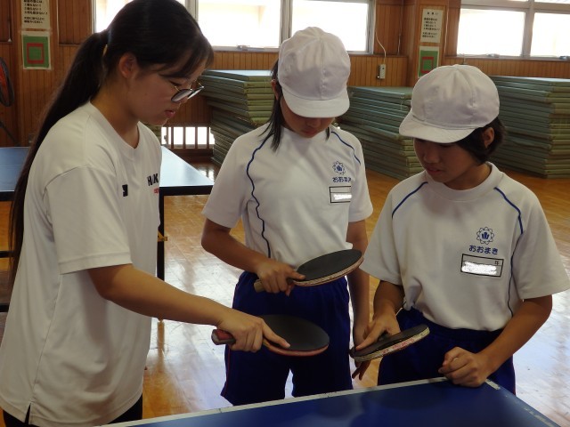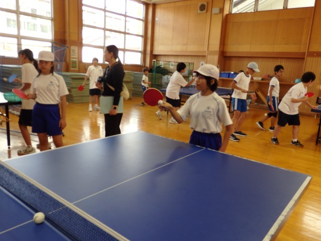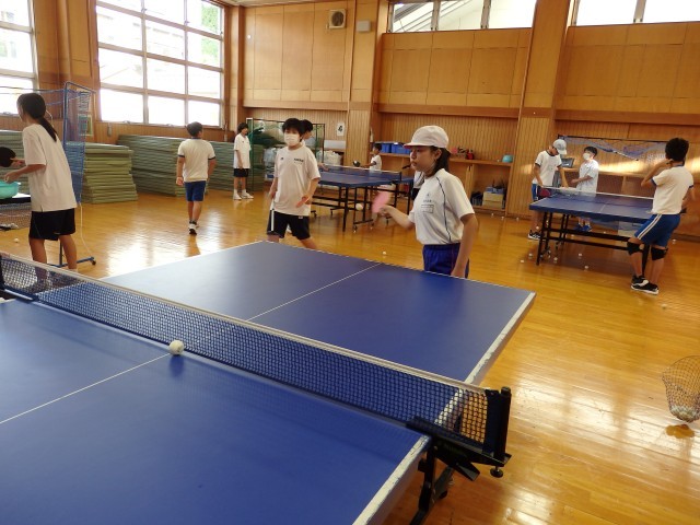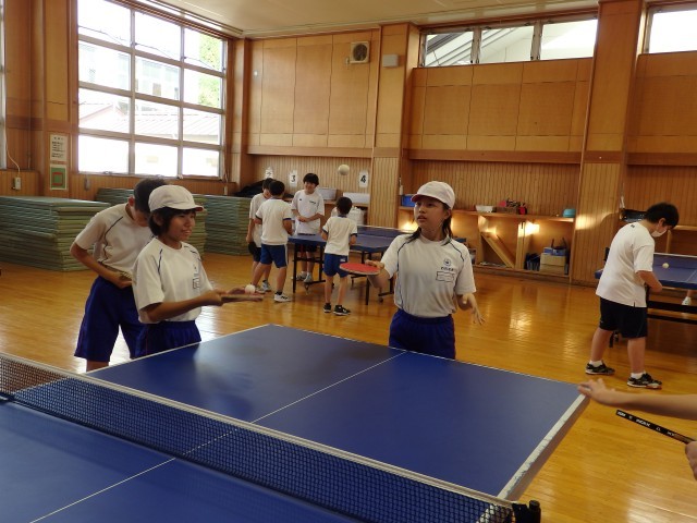 6年生の八海中学校での部活動体験の様子です。前半後半に分かれて2つの部活動を体験します。前半の卓球部、バスケ部、バレー部の様子です。卓球部はラケットの持ち方を教えてもらい、直上にボールを打ち上げたり、先輩が出したボールを返球する練習をしました。バスケ部はボールに慣れるように前の人が投げ上げたボールを後ろの人がキャッチする練習をしました。バレー部は「こおりオニ」をしてから、先輩とペアになってキャッチボールやボールを打つ練習をしました。