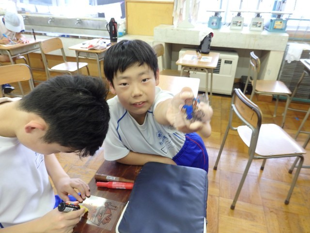 6年生の1時間目は学活の授業でした。学習発表会の準備をしていました。発表の時に使う大道具、小道具作りです。ツルハシや金塊、たらい舟など大小いろいろなものを協力しながら楽しそうに作っていました。「自分たちのアイデアで作ってるんですよ」とのこと。素晴らしい!