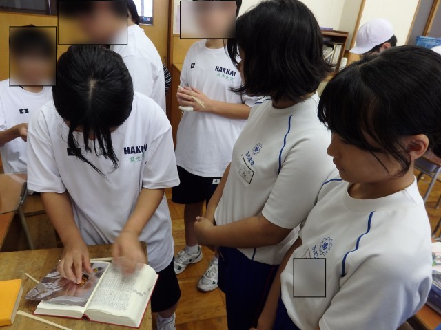 6年生の4時間目は国語の授業でした。市教委にある学習指導センターの指導主事から見ていただく職員研修としての授業です。「模型のまち」の学習です。原爆が投下される以前の広島市の様子を模型にした主人公たちですが、「なぜ模型の色は白いままなのか」について考えました。自分の考えをノートに書いた後、他の人とノートを見せ合って意見交換をしました。読み取った物語の内容をもとにして、一人一人が自分の考えをもつことができました。