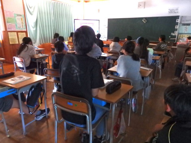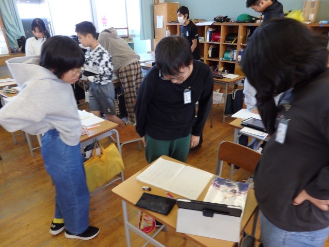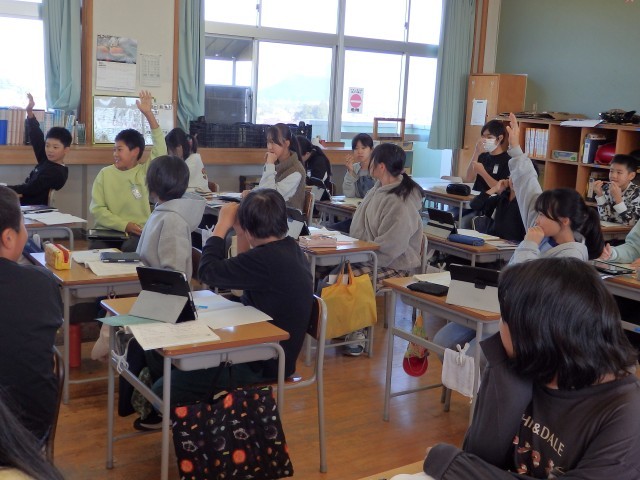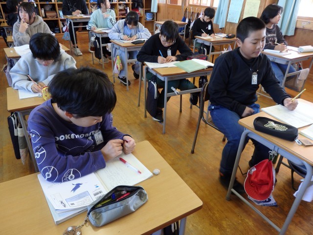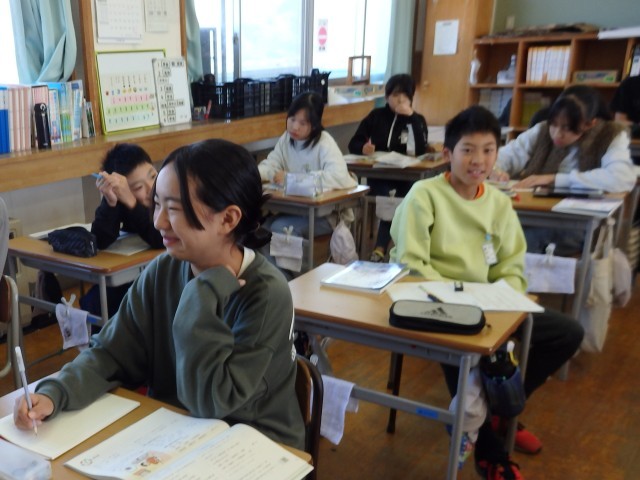 6年生の4時間目は国語の授業でした。市教委にある学習指導センターの指導主事から見ていただく職員研修としての授業です。「模型のまち」の学習です。原爆が投下される以前の広島市の様子を模型にした主人公たちですが、「なぜ模型の色は白いままなのか」について考えました。自分の考えをノートに書いた後、他の人とノートを見せ合って意見交換をしました。読み取った物語の内容をもとにして、一人一人が自分の考えをもつことができました。