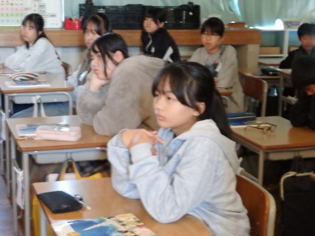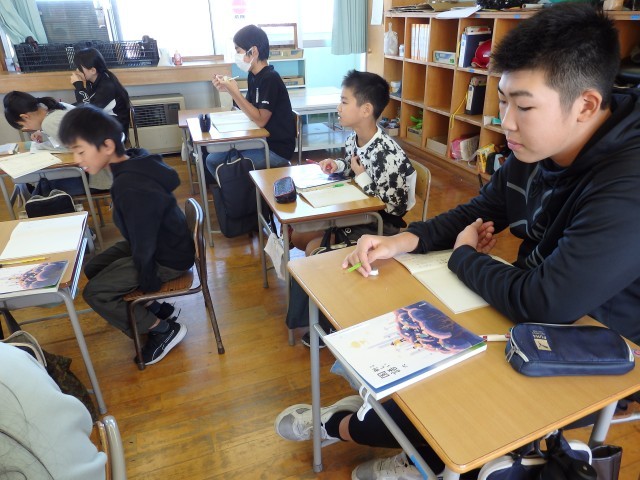 6年生の1時間目は国語の授業でした。「永遠のゴミ プラスチック」の学習です。まずは1人ずつ丸読みで音読していきました。その後、評論文の中心である本論の部分はどんなことが書かれているのかを段落ごとに読み取っていきました。「影響」などの難しい漢字や聞いたことがない「マイクロプラスチック」がどれくらいの大きさなのかも確かめていました。