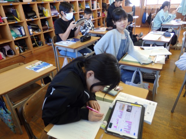 6年生の4時間目は社会の授業でした。江戸時代の文化や学問についての調べ学習をしていました。杉田玄白、本居宣長、伊能忠敬、解体新書などについて教科書や資料集を読み込んで、ノートにまとめていきました。書かれていることをそのまま書くのではなく、要約して自分のことばでまとめることが大切です。まとめ終わったら、インターネットでさらに調べていきました。