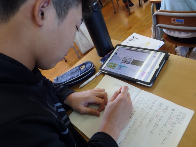 6年生の4時間目は国語の授業でした。今日から「永遠のゴミ プラスチック」という評論文の学習です。まずはプラスチックについて、自分が知っていることや調べて分かったことをiPadのオクリンクプラスというアプリを使ってまとめていきました。「プラスチックのメリットとデメリット」「プラスチックでできている製品」「なぜプラスチックで作られているのか」「マイクロプラスチックとは」などについてスライドにしてまとめていきました。さすが6年生ですね、画像の加工や文字入力などもサクサクと進めていました。