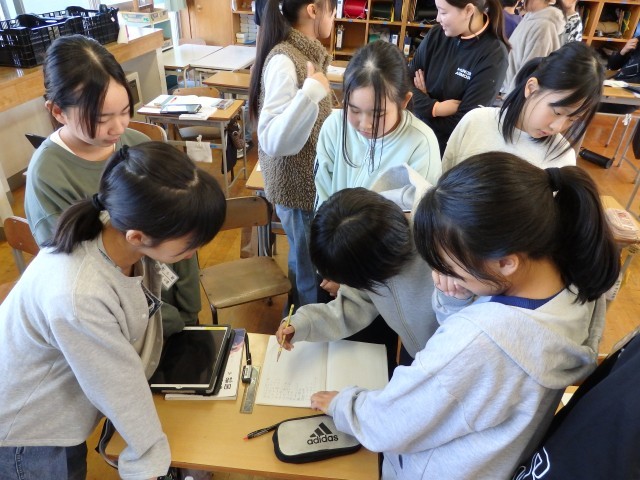 6年生の1時間目は学活の授業でした。学習発表会の準備です。発表内容ごとに分かれたグループに分かれて、シナリオを作っていました。自分たちで意見を出し合い、誰がどのセリフを言うのかも相談しながら作っていました。後半はiPadで作ったシナリオをグループで共有して練習したり、小道具を作ったりしていました。