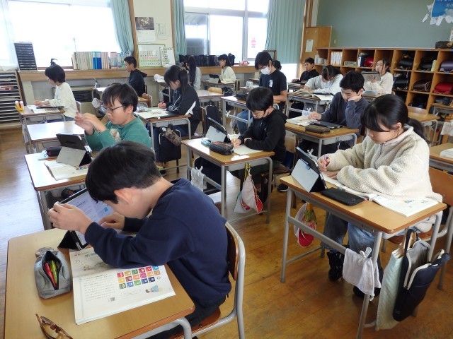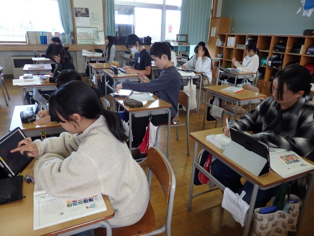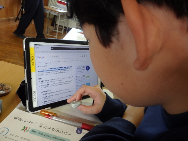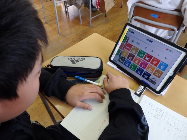 5年生の4時間目は国語の授業でした。「考えよう 私たちのSDGs」の学習です。まずは、そもそもSDGsって何なのかを確認しました。「Sustainable Development Goals」の略で「持続可能な開発目標」であること、17個の目標は具体的にどんな内容なのかなどをインターネットで調べたり、教科書のQRコードからリンクしている資料集で調べていきました。「あと5年で達成しなきゃなんだよ」とよく知っている子がいました。