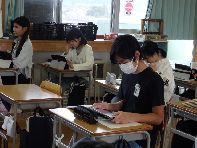 6年生の4時間目は国語の授業でした。市教委にある学習指導センターの指導主事から見ていただく職員研修としての授業です。「模型のまち」の学習です。原爆が投下される以前の広島市の様子を模型にした主人公たちですが、「なぜ模型の色は白いままなのか」について考えました。自分の考えをノートに書いた後、他の人とノートを見せ合って意見交換をしました。読み取った物語の内容をもとにして、一人一人が自分の考えをもつことができました。