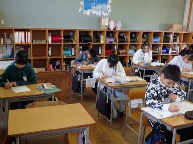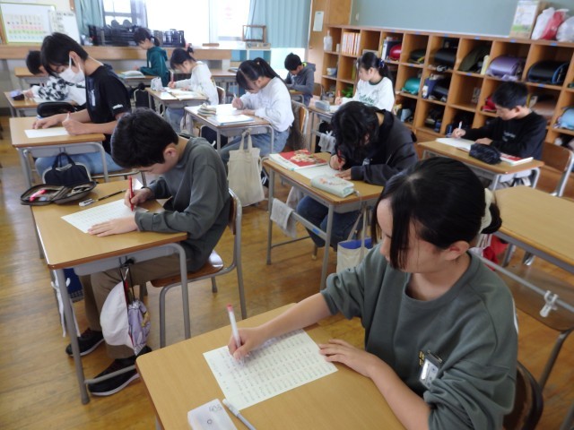 6年生の5時間目は学活の授業でした。学習発表会のステージ練習です。自分たちの発表の練習をしたあと、閉会式での「終わりのことば」の練習も行いました。リコーダーの演奏をバックに、これまで頑張ってきたことや苦労したことなどについて語っていきます。6年生が最後をしっかり締めてくれます。