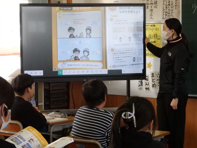 6年生の1時間目は算数の授業でした。「図形」についての学習です。円の面積の求め方を学びました。1人1人に中心を通る線が何本も描かれている円が配られました。円を4等分した細長い扇形を組み合わせてできる1つの三角形の面積をまずは考えました。その4つ分で円の面積ですね。そのように少しずつ段階を踏みながら円の面積の公式を学びました。あの公式ってそういう意味だったんですね。