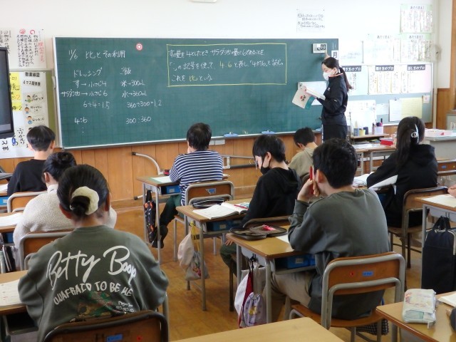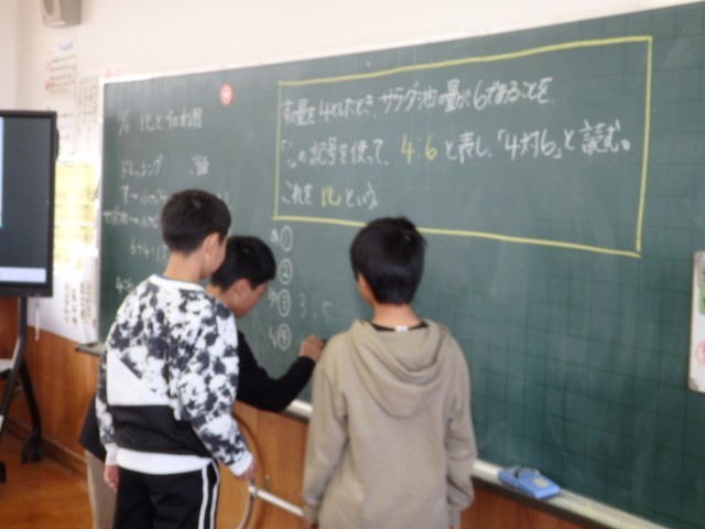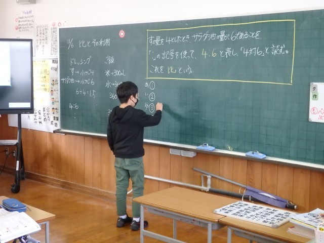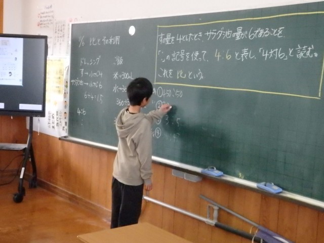 6年生の1時間目は算数の授業でした。最初に九九の問題81問に取り組みました。分数の約分を早く正確に行うための練習のようです。その後、「比の活用」の学習に入りました。「ドレッシングをつくるために酢が小さじ4杯、サラダ油が小さじ6杯必要です」という文から酢とサラダ油の割合を4:6で表せることを学びました。その後、同様の問題に取り組みました。