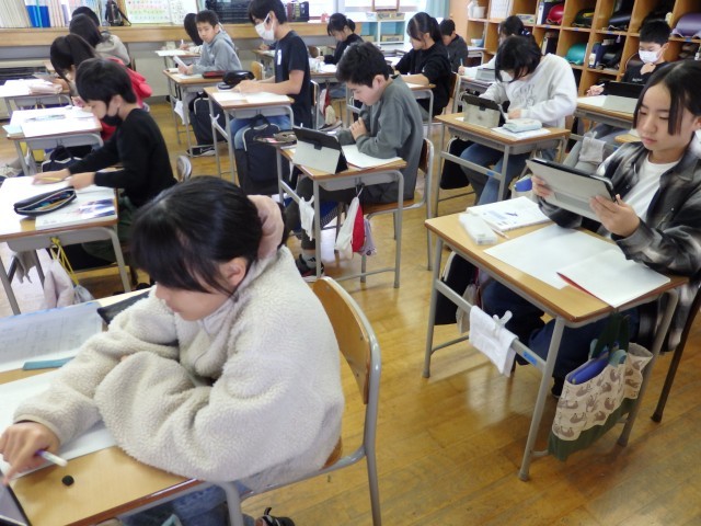 6年生の2時間目は学活の授業でした。昨日の学習発表会リハーサルの動画を見て、改善点を確認していました。合奏でのテンポや音を伸ばす長さ、セリフを言うときの声量や声の出し方などを確認していました。指揮を担当する子が動画を見ながら指揮の練習をしていました。明日はいよいよ小学校生活最後の大きな行事です。立派にトリを務めてくれることを期待しています!