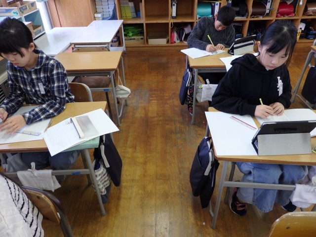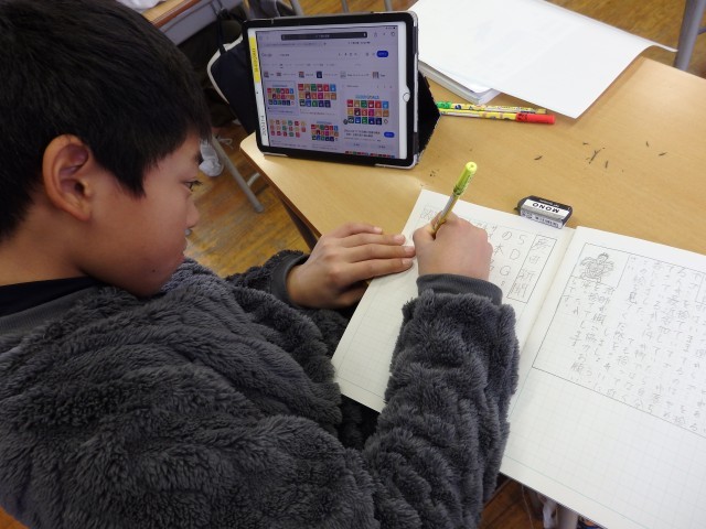 6年生の4時間目は社会の授業でした。江戸時代の文化や学問についての調べ学習をしていました。杉田玄白、本居宣長、伊能忠敬、解体新書などについて教科書や資料集を読み込んで、ノートにまとめていきました。書かれていることをそのまま書くのではなく、要約して自分のことばでまとめることが大切です。まとめ終わったら、インターネットでさらに調べていきました。