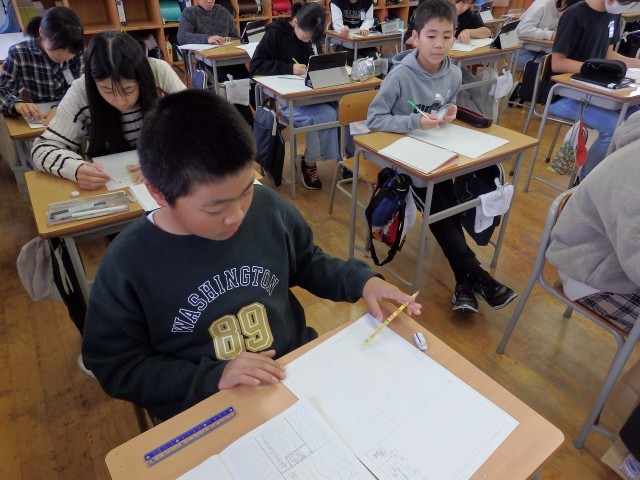 6年生の1時間目は国語の授業でした。SDGsについて調べ学習をしていました。調べて分かったことをただノートに書くだけでなく、新聞形式にして見出しやレイアウトなどを工夫しながらまとめていました。中には「サンポ速報」という題にしてる子がいました。どういう意味なんでしょう?黒板に貼ってある実際の新聞を参考にして「読みやすいレイアウトの仕方」を考えていました。