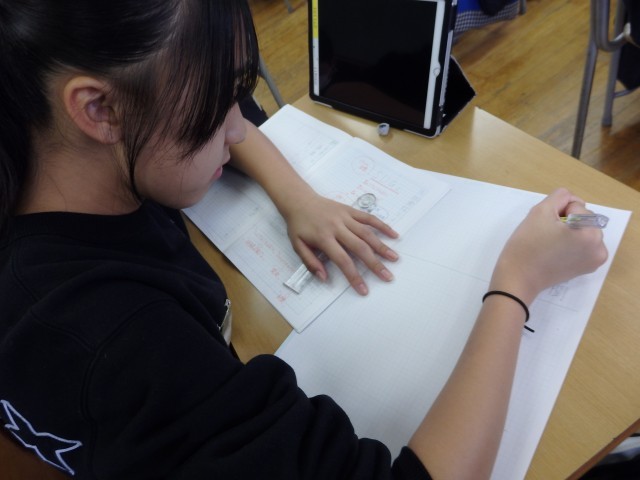 6年生の3時間目は算数の授業でした。円の学習です。「円周の長さが62.8cm」の円の直径の長さと面積を求める問題に取り組んでいました。近くの人とやり方や答えを確かめ合ったり、教えあったりしながら取り組んでいました。やり方が分かったところで、もう1問はレベルアップした問題に挑戦です。