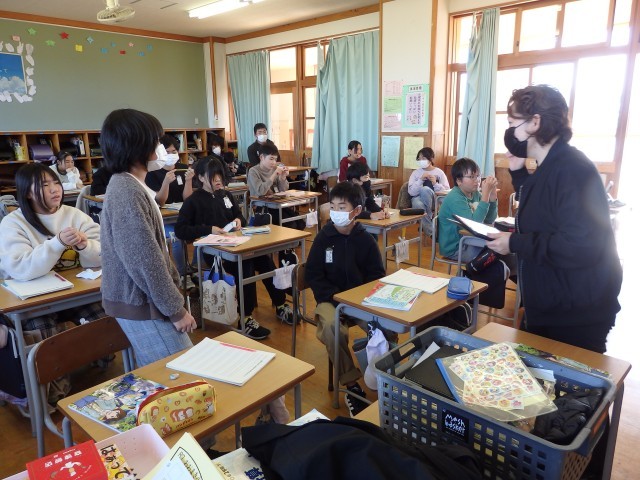 6年生の保育園訪問、四十日保育園の様子です。まずは園児たちから元気いっぱいな歌のプレゼントがありました。途中の「エイヤー!」という掛け声を一緒にやっている子がいました。その後、保育園の先生から「保育園の先生の仕事」についてお話をしていただきました。「仕事をしていてうれしいこと」や「大変なこと」などの話をお聞きすることができました。その後、園児たちに1人ずつ自己紹介をしていきました。園児たちのリクエストで「好きな食べ物」と「好きなこと」を話しました。その中で「ピアノが好き」と言った子が園長さんのリクエストを受けて『千本桜』を弾いてくれました。