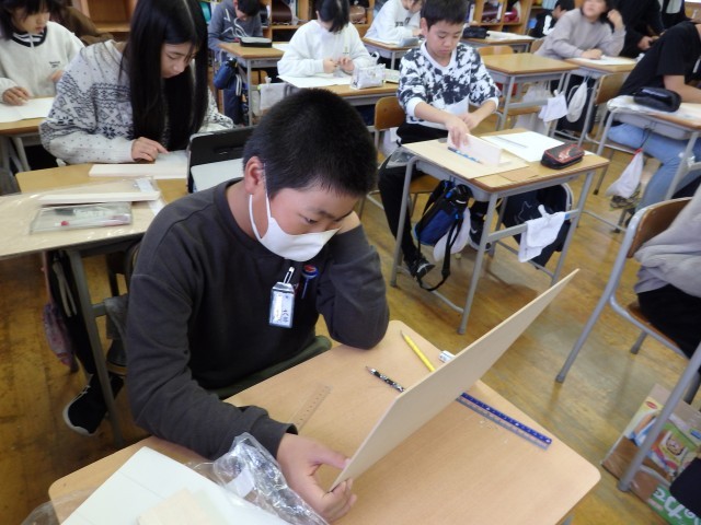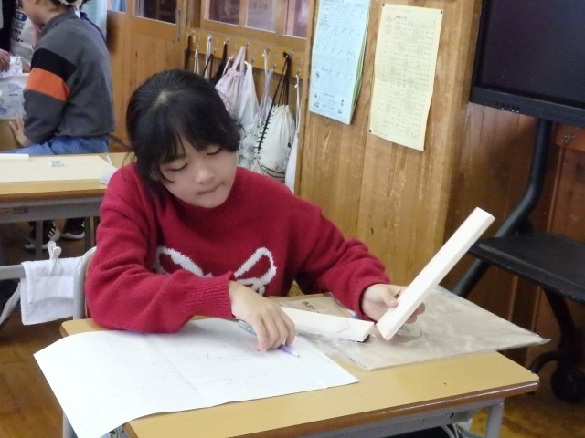 6年生の5時間目は図工の授業でした。「1枚の板から」という学習です。『12歳の力で』という教材を使って、1枚の板から物づくりをします。まずは教材に付いていたQRコードを読み込んで、ティッシュボックスや本棚の作り方の動画を見ました。その後、教材に入っていた作品例の写真や板をじーっと見ながら、何を作ろうかじっくり考えていました。