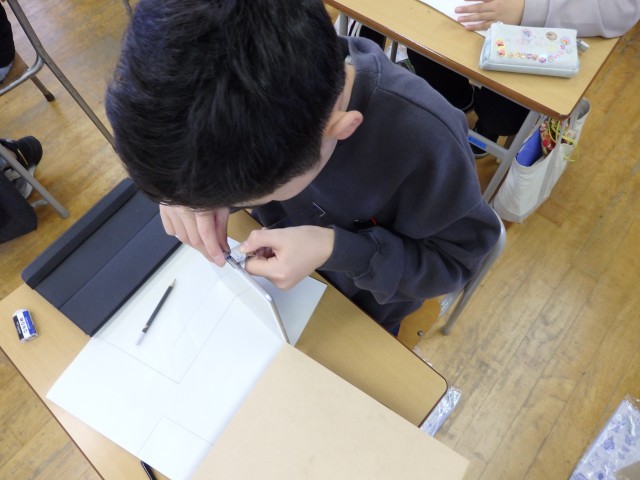 6年生の5時間目は図工の授業でした。「私はデザイナー」という制作活動です。いろいろな種類の木材からティッシュボックスケースやスマホスタンドなどを作ります。最初の3枚の写真で自分が作りたい物を木材のどこを使おうかと真剣に悩んでいる様子がよく分かりますね。そして突然「できた!」と言って「ここをこうして・・・」と説明してくれた子がいました。iPadの厚さを定規で測ったり、ティッシュボックスを木材に当てて寸法を合わせたり、まずは紙で展開図を作って組み立てたりしている子もいました。